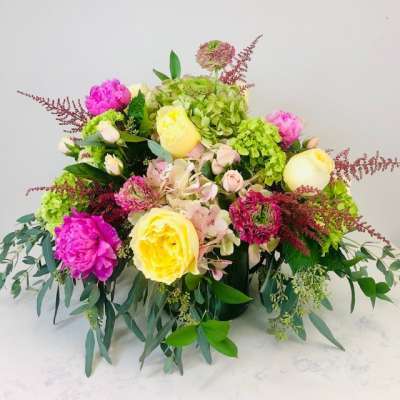 This arrangement is larger than it appears in the photo (approx. 24″ in height) with antique hydrangea, mini green hydrangea, peonies, garden roses, ranunculus, spray roses, astilbe, seeded eucalyptus, and Israeli ruscus in a glass cylinder vase.