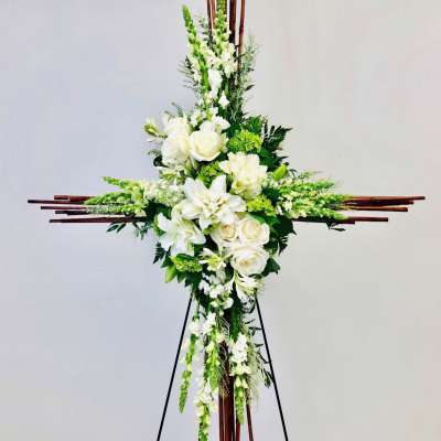 The resilience of bamboo speaks of strength and is the frame for this beautiful cross. The arrangement has white lilies, roses, snapdragons, stock, tuberose, green hydrangea, and mixed greenery.