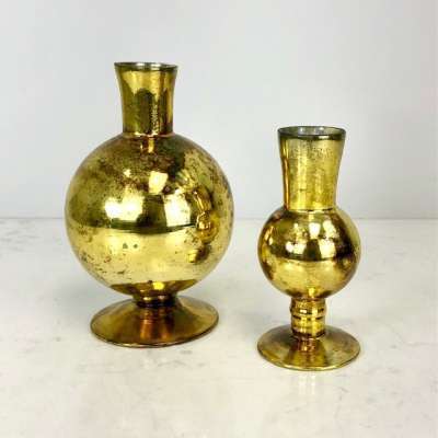 These bud vases are a gold mercury glass. The small size measures 2.25″ w. x 4.75″ h. and the large size measures 3.75″ w. x 6.25″ h.
