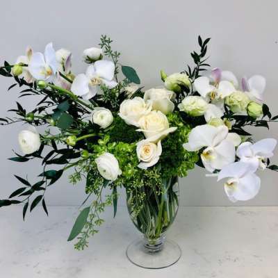 This beautiful green and white arrangement has white roses, ranunculus, lisianthus, orchids, with shamrock hydrangea, seeded eucalyptus, Italian ruscus, and lily grass in a pedestal glass vase.
