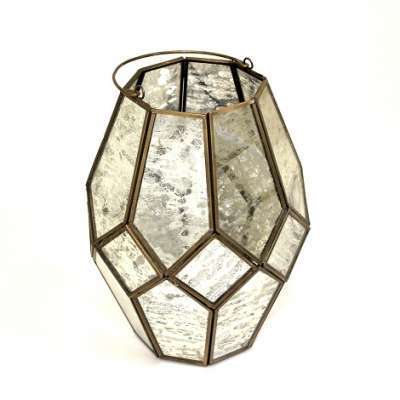 This lantern can hang or be used as a floor or table decoration. It is 10″ tall with a maximum width of 8.5″. The top and base are 4″ wide.